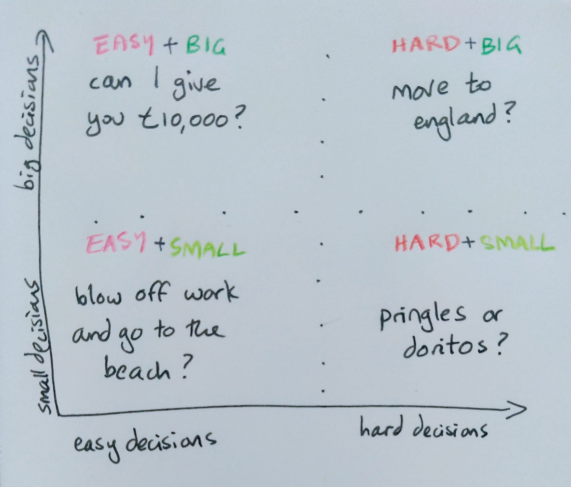 I'm a pathological life-optimiser, but I'm also somebody who's always struggled making hard decisions. Ending relationships, starting new careers, moving cities... It takes me AGES to think through questions like this. I tie myself in knots thinking through every possible eventuality. I make spreadsheets. I make pros and cons lists. I make mind-maps. And then weeks go by and I realise I still haven't made... a damn decision.