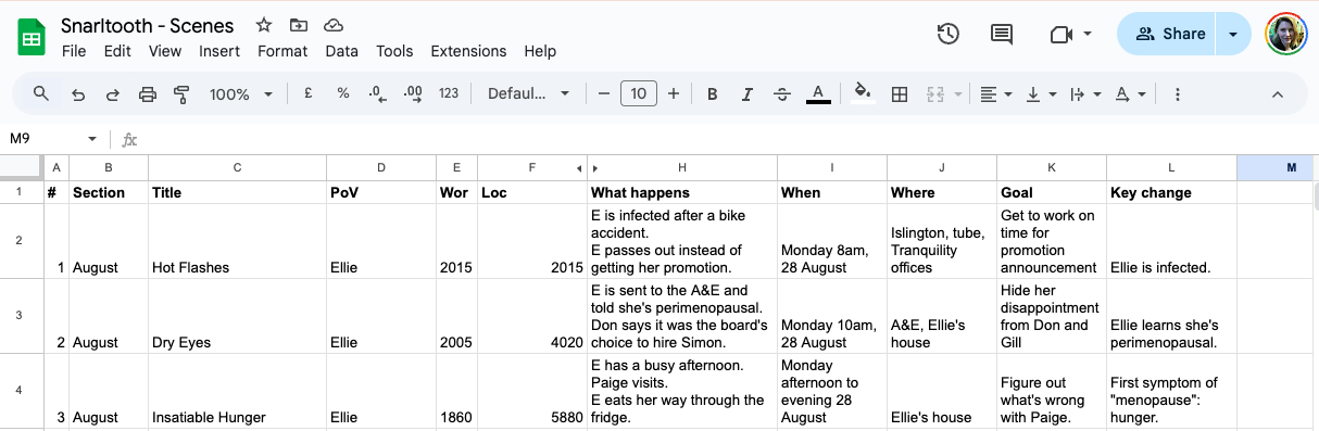 - Location (what % of the way through the book is the scene? - I find this helpful to work out if, for instance, I'm taking too long to get to the inciting incident)